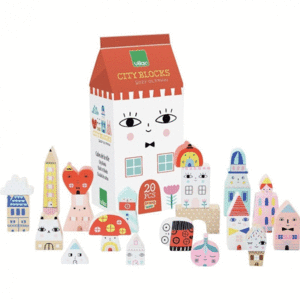 Cofre de 20 cubos de madera diseñados por Suzy Ultman. Diseña y construye tu pequeño pueblo con estos bloques de madera, perfectos para dejar volar la imaginación del peque. Gracias a sus formas, colores y diseño enamorarán al peque rápidamente.