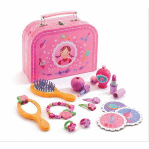 Maletín de belleza de Djeco. Incluye: espejo, peine, pintalabios, perfume, pintauñas, pulsera, gomas de pelo, clips de pelo, etc.