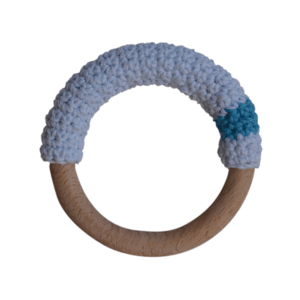 El mossegador de fusta bio blau cel és una joguina sensorial per a bebès que l’acompanyarà en els seus primers descobriments. És una anella de fusta i la meitat de l’anella està coberta amb punt de ganxet fet a mà. És fàcil d’agafar i precisament perquè són senzilles, ofereix múltiples formes d’exploració i experiències. També pot servir com a mossegador i ajudar a calmar les genives quan estant sortint les dents.