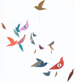 Pájaros multicolores de Katsumi Komagata. Uno de los artistas más reconocidos del panaorama infantil y que siempre juega con la belleza del papel. Mòvil precioso nacido de la colaboración entre Komagata i Christel Sadde, criadora de esculturas móviles.