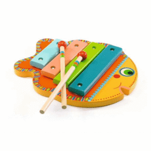 Divertido xilófono de madera con forma de pez y divertidos colores.