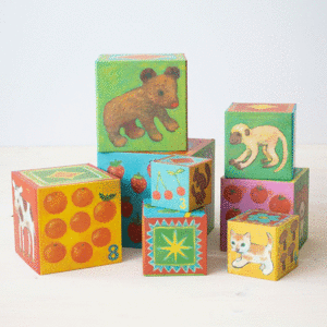 Cubos apilables con motivos de caras, animales, puntos para iniciación a los números.