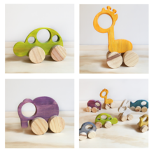 Colección de animales rodantes, coloridos o en madera natural hechos en madera de pino de fácil agarre para los mas pequeños.