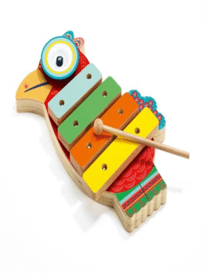 Xilófono y cimbálo de madera con las teclas metálicas. 2 baquetas de madera incorporadas harán un sonido muy agradable. 4 notas musicales y un platillo.