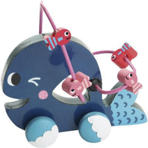 Divertida ballena cochecito de madera con un pequeño circuito con 4 pelotitas para pasar por el alambre, sirve mejorar la psicomotricidad fina.
