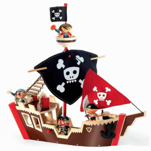 ! Todo listo para zarpar con este estupendo barco pirata de madera! Tiene 2 velas de tela, plataforma extraíble y ancla con cuerda!