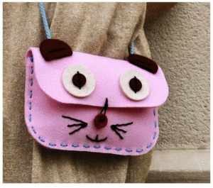 Contiene todo los elementos necesarios para realizar el bolso: Correa para el boslo, hilo, aguja de coser, e iinstrucciones . El resultado será una pequeño bolso con la simpática cara de un gato.
