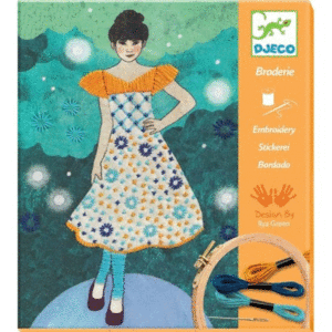 Un completo kit de iniciación al bordado que permite al niño adornar con colores y motivos la vestimenta de esta delicada jovencita.