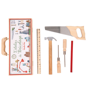 Mans a l'obra! Una caixa d'eines de veritat amb estil retro. Porta les eines indispensables per a dedicar-se a la fusteria: serra, martell, regla, llapis i 2 tornavisos. Un joc simbòlic que acostarà al petit/a a la mama i al papa gràcies a la imitació. Material: Fusta massissa i acer. A partir de 6 anys. Dimensiones12x30x5 cm.