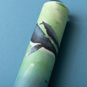 Amb una bonica il·lustració d'una balena i la seva cria, observa el teu voltant des d'una altra perspectiva i deixa volar la teva imaginació per aquesta petita finestra oberta a un món ple de colors i formes diferents.