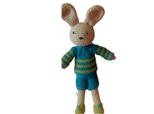 Conill verd Ratlles. Preciós conillet fet a mà de ganxet per la casa barcelonina Punt a punt. Fan peces que són úniques, ben acabades i cuquetones. ?