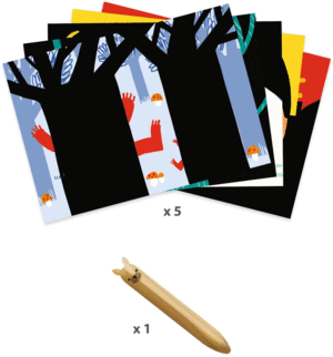 -Los más pequeños necesitan mucho espacio. He aquí 5 fantásticos cuadros para rascar sobre los animales con un gran punzón de madera apto para los más pequeños, a partir de los 18 meses. Con los dos extremos del punzón, el niño rasca la superficie de la tarjeta para trazar motivos o descubrir sorpresas, ¡qué agradable! Aunque se deje llevar y lo rasque todo, el resultado será igual de bonito.
