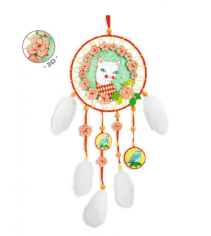 Un complet kit creatiu per fer un poètic atrapasomnis, decorant la imatge del gat amb fils de colors, comptes, cintes i plomes. Un bonic objecte decoratiu per penjar a l'habitació i espantar els malsons ...