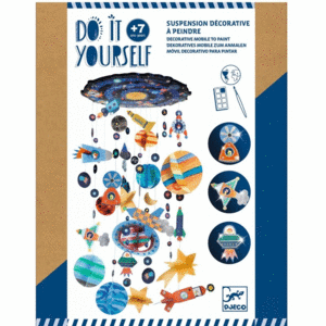 Contingut: 5 làmines amb planetes i estrelles pretallades per pintar, 2 làmines amb coets i estrelles, 1 paleta de trempes (8 colors), 1 pinzell, fil de niló, 1 ganxo autoadhesiu, 1 manual d'instruccions.