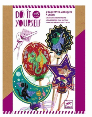 -Un kit creativo para crear 4 varitas mágicas. El niño monta y decora las varitas mágicas con las pegatinas, las calcomanías y las cintas incluidas. Una vez montadas, las varitas están listas para lanzar hechizos y brillar por la noche con su acabado fosforescente... ¡son mágicas!