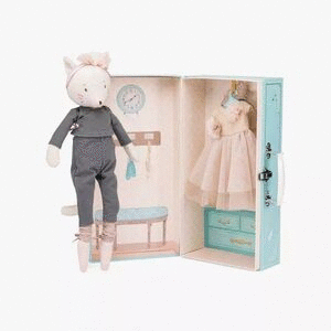 Célestine, la muñeca gata, nos invita a entrar en su armario. Una maleta armario con espejo integrado que incluye conjunto de calentamiento y vestido de gala en percha. Pequeños pasos, pas de deux, pas de chats... hay que practicar antes del espectáculo de fin de año.