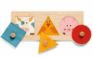 -Un primer puzle de madera para descubrir formas geométricas simples y los colores. El niño se divierte escondiendo los animales colocando las tres formas geométricas en sus lugares correspondientes. Cuando el niño levanta las piezas... ¡sorpresa! Descubre de nuevo los animalitos ilustrados debajo de cada una de ellas.