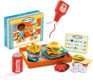-Esta bonita caja de madera encierra todos los accesorios que necesitas para preparar tres deliciosas hamburguesas. El niño puede preparar las hamburguesas a su gusto o seguir las sugerencias de la tarjeta menú. ¡A comer!