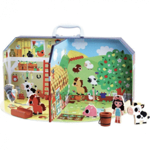 La granja petita de VILAC, ideal per portar de viatge es transforma en una maleta per portar a tot arreu. Inclou 14 peces de fusta, animals, accessoris, per jugar tant com vulguis.