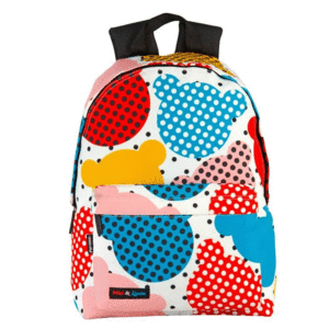 Mochila junior de color blanca con detalles de colores, con un espacio principal con cierre de cremallera, bolsillo frontal con cierre de cremallera, tirantes acolchados y ajustables, espaldera acolchada, sistema para adaptarla a carros portamochilas, asa de mano superior y tiras reflectantes.