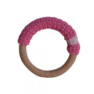 El mordedor de madera bio rosa claro es un juguete sensorial para bebés que le acompañará en sus primeros descubrimientos. Es una anilla de madera y la mitad de la anilla está cubierta con punto de ganchillo hecho a mano. Es fácil de agarrar y precisamente porque son sencillas, ofrece múltiples formas de exploración y experiencias. También puede servir como mordedor y ayudar a calmar las encías cuando estando saliendo los dientes.