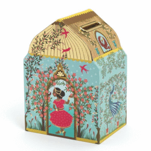 Encantadora hucha de madera con ranura con borde metálico para insertar las monedas y tapón de plástico para sacar las monedas.