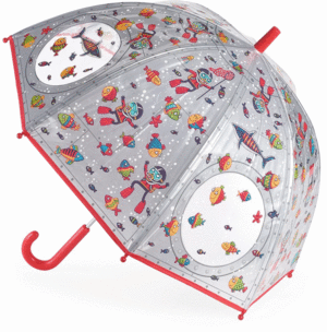 ¡Un paraguas moderno y práctico con detalles submarinos y un mundo submarino para descubrir a través de los ojos de buey! Apertura manual, con sistema de seguridad para que los niños puedan abrir y cerrar sin pillarse los dedos..