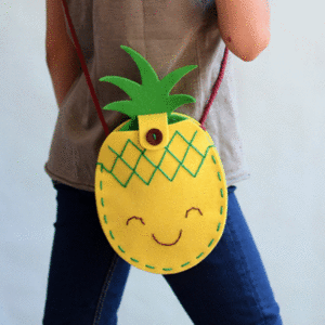 Kit para coser un bolso con forma de PIÑA: de una manera fácil e intuitiva el niño cose y decora el bolso él solo, mientras se divierte refuerza su psicomotricidad fina y su concentración.
