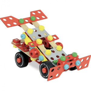 Incluye diferentes formas, colores, tuercas,... Para poder crear vehículos como: un coche de carreras, un avión, un camión y un helicóptero.