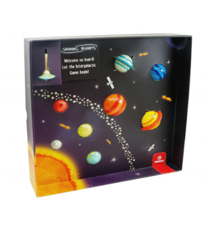 Un conjunto de 9 peonzas giratorias de madera (8 planetas y 1 nave espacial), 8 tarjetas de información y 24 tarjetas de misión que tienen múltiples niveles de valor educativo y de juego.