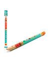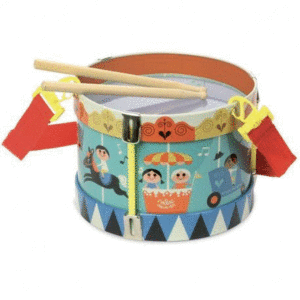 Tambor de metal con bonitas ilustraciones de Ingela P. Arrhenius, tapa transparente y 2 bolas en su interior. Incluye dos baquetas y un cordón para colgarlo y que los niños lo puedan manejar con facilidad.